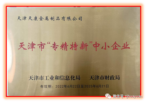 近期,天津天康金属制品有限公司被天津市工业和信息化局以及天津市财政局联合认定为天津市“专精特新”中小企业,有效期三年。